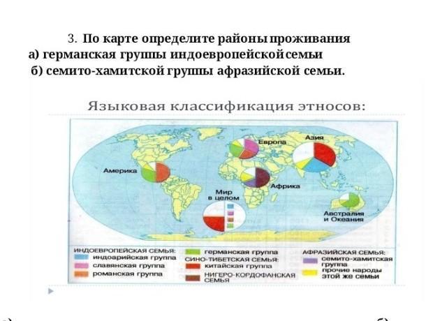 3. По карте определите районы проживания а) германская группы индоевропейской семьи б) семито-хамитской группы афразийской семьи. Языковая классификация этносов: