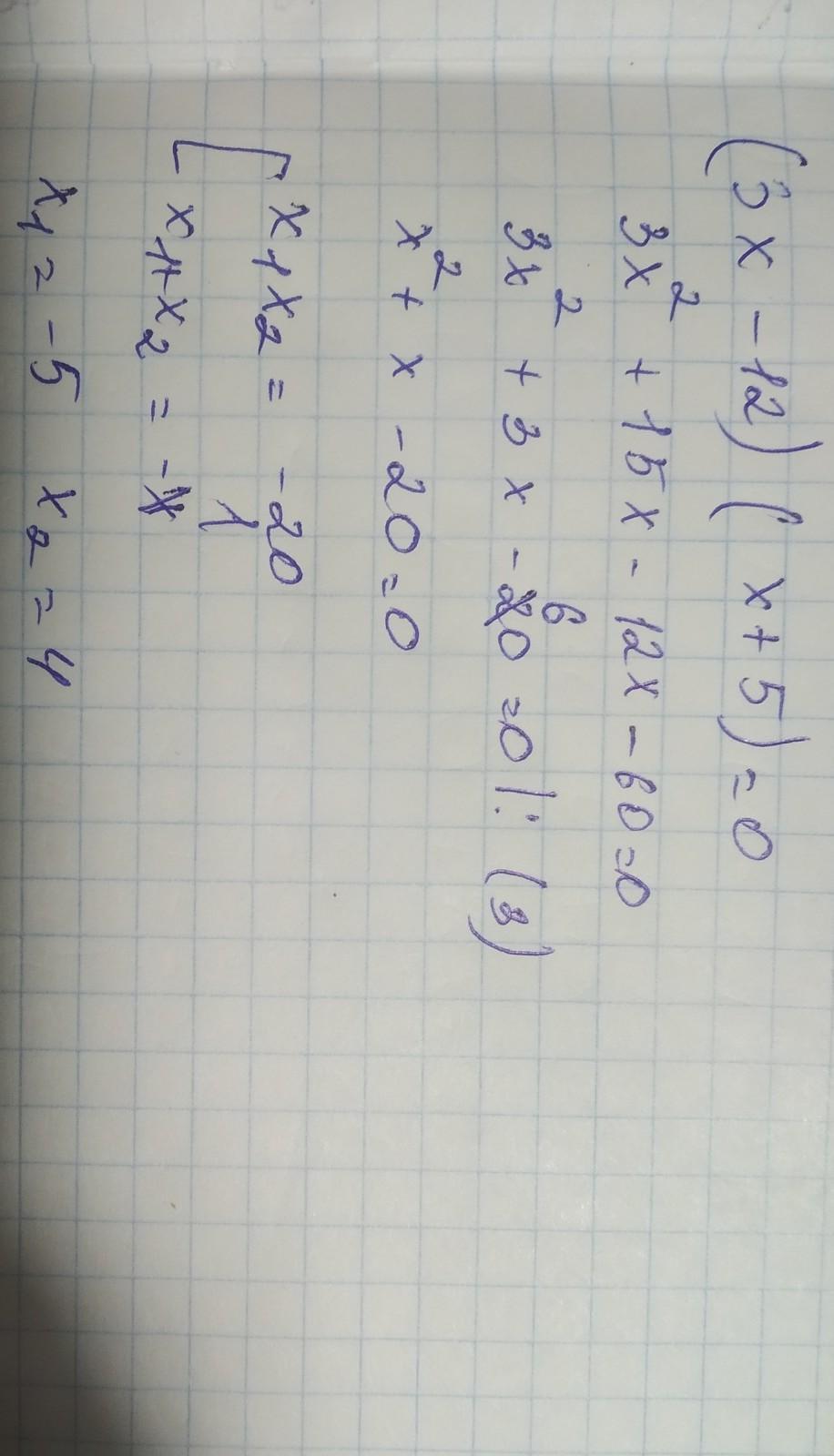 Найди корни уравнения: (3x−12)⋅(x+5)=0.