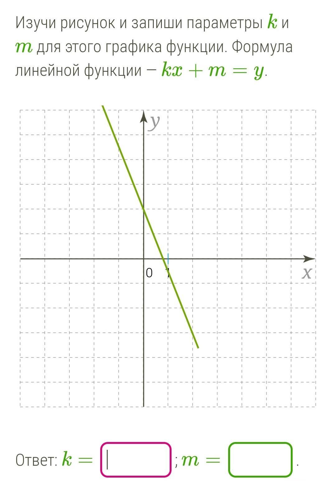 Изучи рисунок и запиши параметры k и m для этого графика функции. Формула линейной функции kx+m=y.