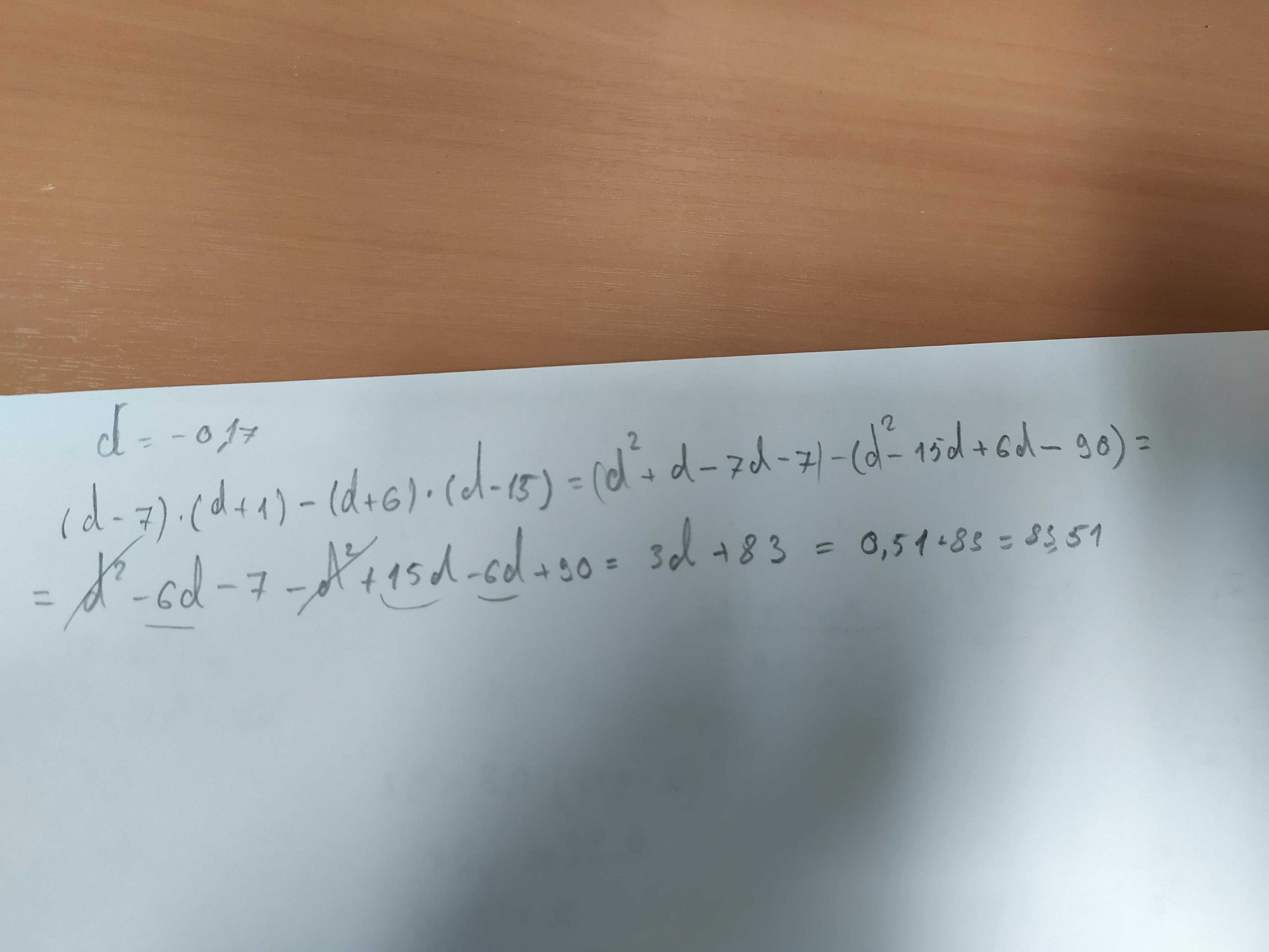 Найди значение выражения при d=−0,17, предварительно упростив его: (d−7)⋅(d+1)−(d+6)⋅(d−15). Значение выражения равно