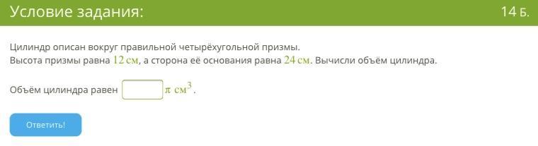 V=Sосн*Н=288π*12=3456π см³ объем цилиндра.