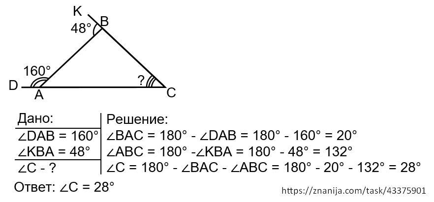 В треугольнике АВС внешний угол при вершине А равен 160 градусов , а внешний угол при вершине В равен 48 градусов. Найдите угол С.