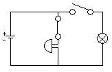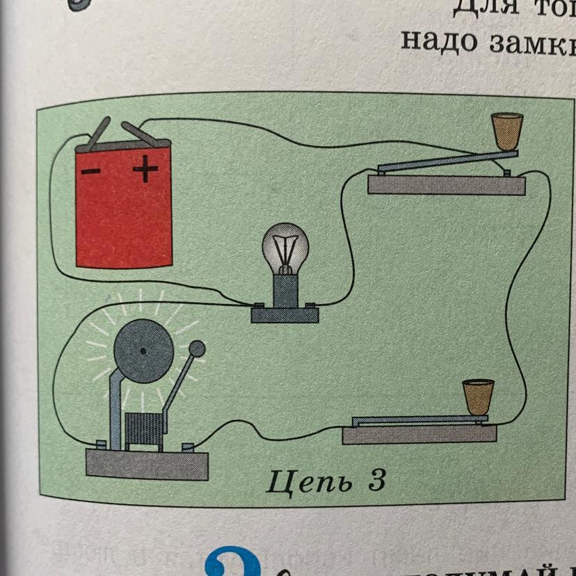 Лампочка, батарея, два выключателя ( один замкнут, второй разомкнут) звонок.