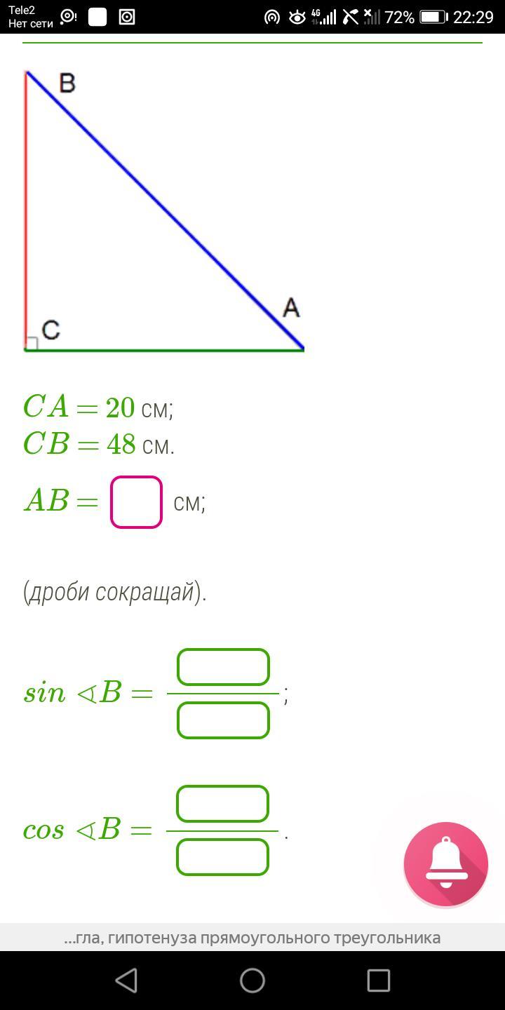 По теореме Пифагора АВ=√(20²+48²)=√400+2304)=√2704=52 см.