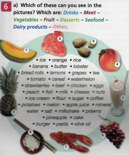 Ice - other, orange - fruit, rice - other, banana - fruit, butter - dairy product, lobster - seafood, bread rolls - other, lemons - fruit, grapes - fruit, tea - drink, tomato - vegetable, cereal - other, watermelon - fruit, strawberries - other, beef - meat, chicken - meat, eggs - other, peach - fruit, fish - seafood, milk - dairy product, cheese - dairy product, nuts - other, ice cream - dessert, flour - other, sugar - other, coffee - drink, potatoes - vegetables, melon - fruit, apple juice - drink, mineral water - drink, salt - other, milkshake - drink, prawns - seafood, pineapple - fruit, cake - dessert, burger - other, pasta - other, olive oil - other.