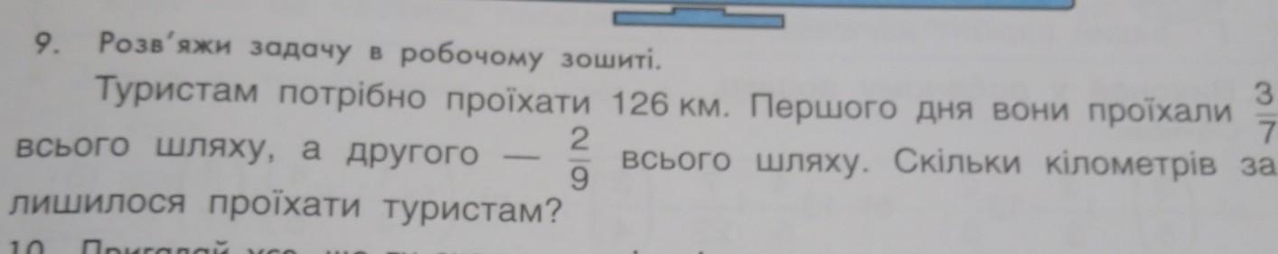 Туристам потрібно проїхати 126км. Першого дня вони проїзали 3/7 всього шляху, а другого 2/9 всього шляху. Скільки кілометрів залишилося проїхати туристам? даю 25б. будь ласка з поясненням