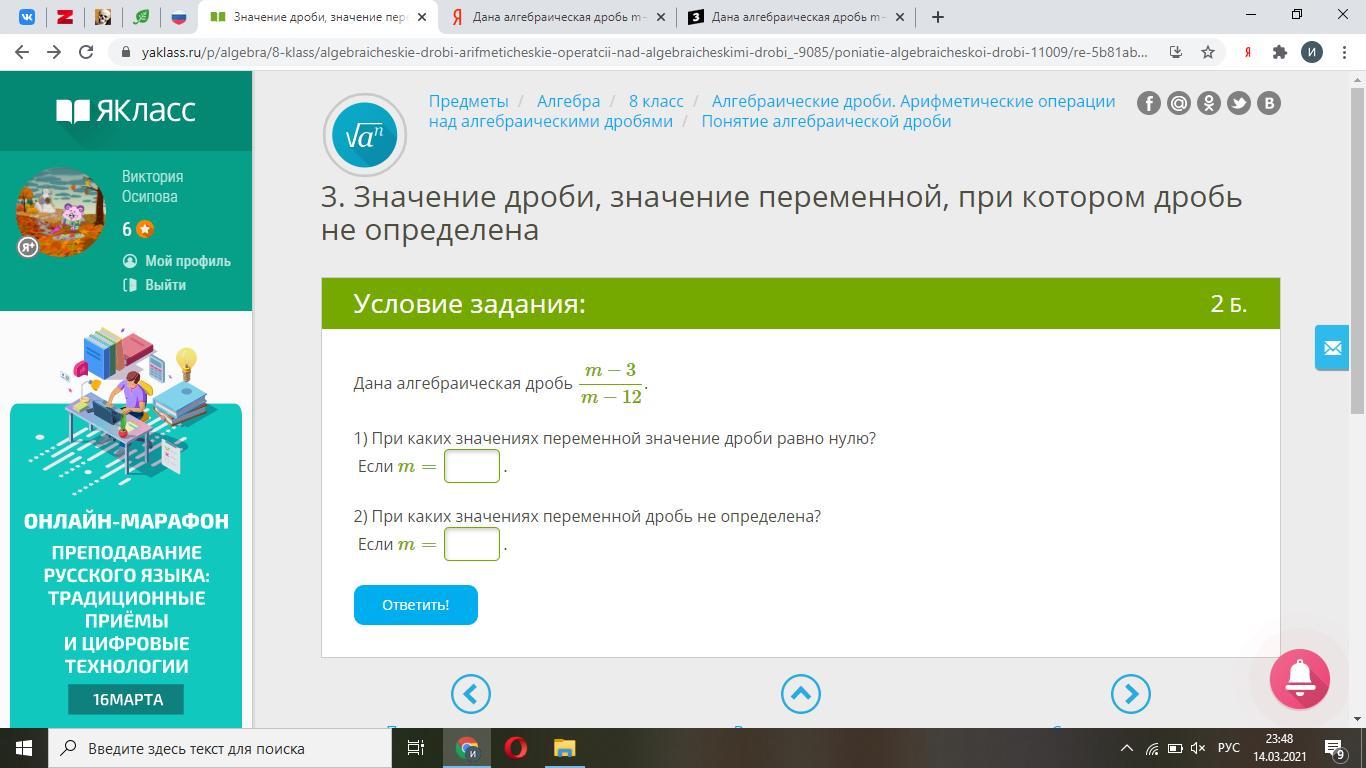 При m равно 3 выражение (3-3)/(3-12)=0/-9=0