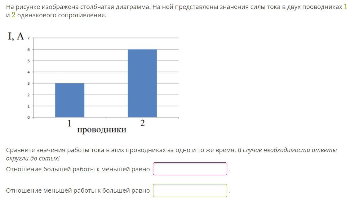 Сравните значения работы тока в этих проводниках за одно и то же время. В случае необходимости ответы округли до сотых!