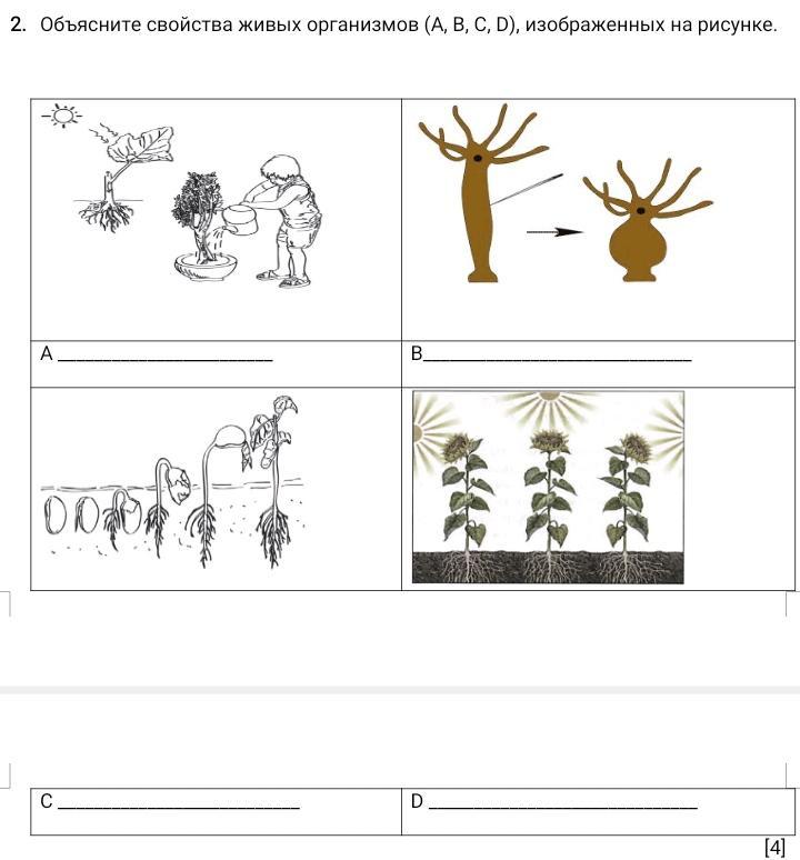 ПОМОГИТЕ СРОЧНО ПОЖАЛУЙСТА Объясните свойства живых организмов (А, В, С, D), изображенных на рисунке.