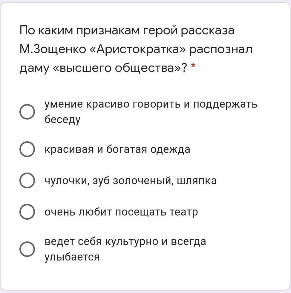 Ответ: Для героя признаки аристократизма — это шляпка, чулочки фильдекосовые, мопсик, зуб золотой.