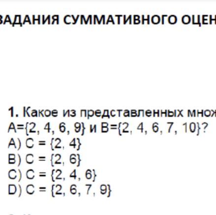 1. Какое из представленных множеств являет A=\ 2,4,6,9\ B=\ 2,4,6,7,10\ ? A)C=\ 2,4\ B) C=\ 2,6\ C) C=\ 2,4,6\ C=\ 2,6,7,9\