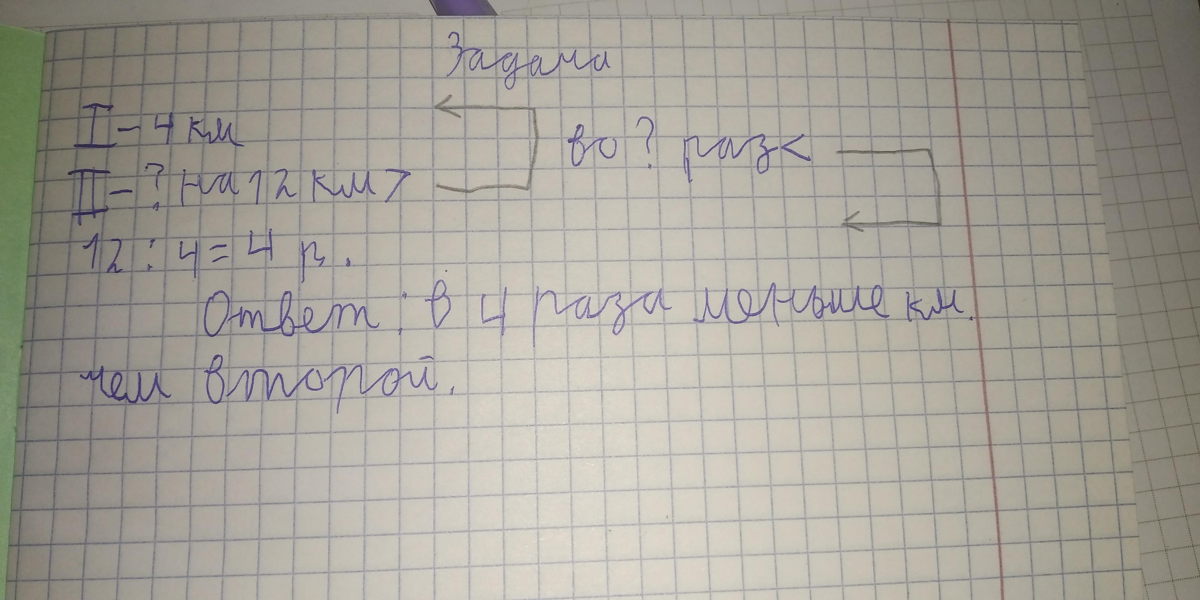 на лыжную прогулку вышли два мальчика один из них проехал на лыжах 4 км а другой на 12км больше Во сколько раз меньше км проехал первый мальчик чем второй?