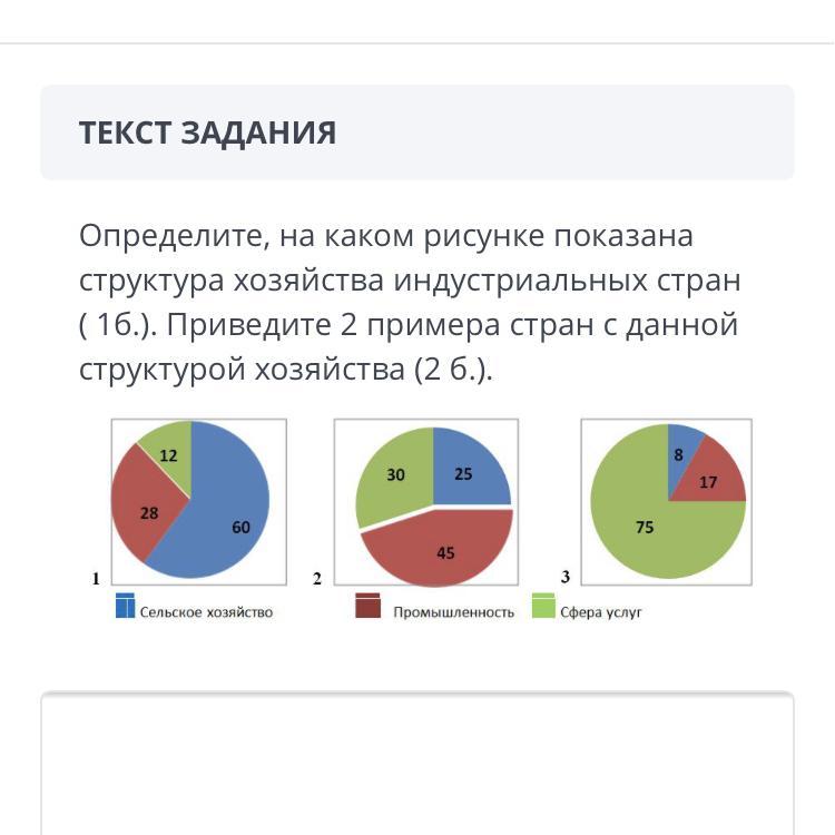 Определите, на каком рисунке показана структура хозяйства индустриальных стран.У индустриальных стран ведущей отраслью является обрабатывающая промышленность.Поэтому их структура показана на рисунке 2.