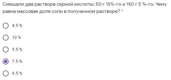 Смешали два раствора серной кислоты: 50 г 15%-го и 150 г 5 %-го. Чему равна массовая доля соли в полученном растворе?