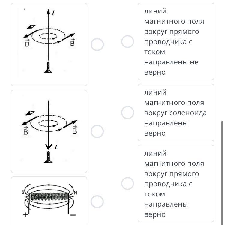 Соотнесите правильное и не правильное направление силовых линий магнитного поля вокруг прямого проводника с током и соленоида.