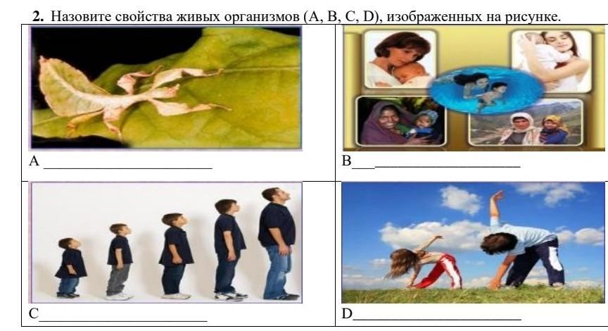 Назовите свойства живых организмов (А, В, С, D), изображенных на рисунке.