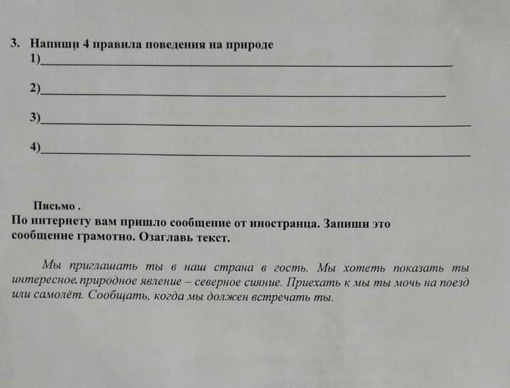 Мы приглашаем тебя в нашу страну в гости .Мы хотим показать тебе интересные природное явления Северное сияние приехать к нам Ты можешь на поезде или самолете Сообщи когда мы должны встретить тебя