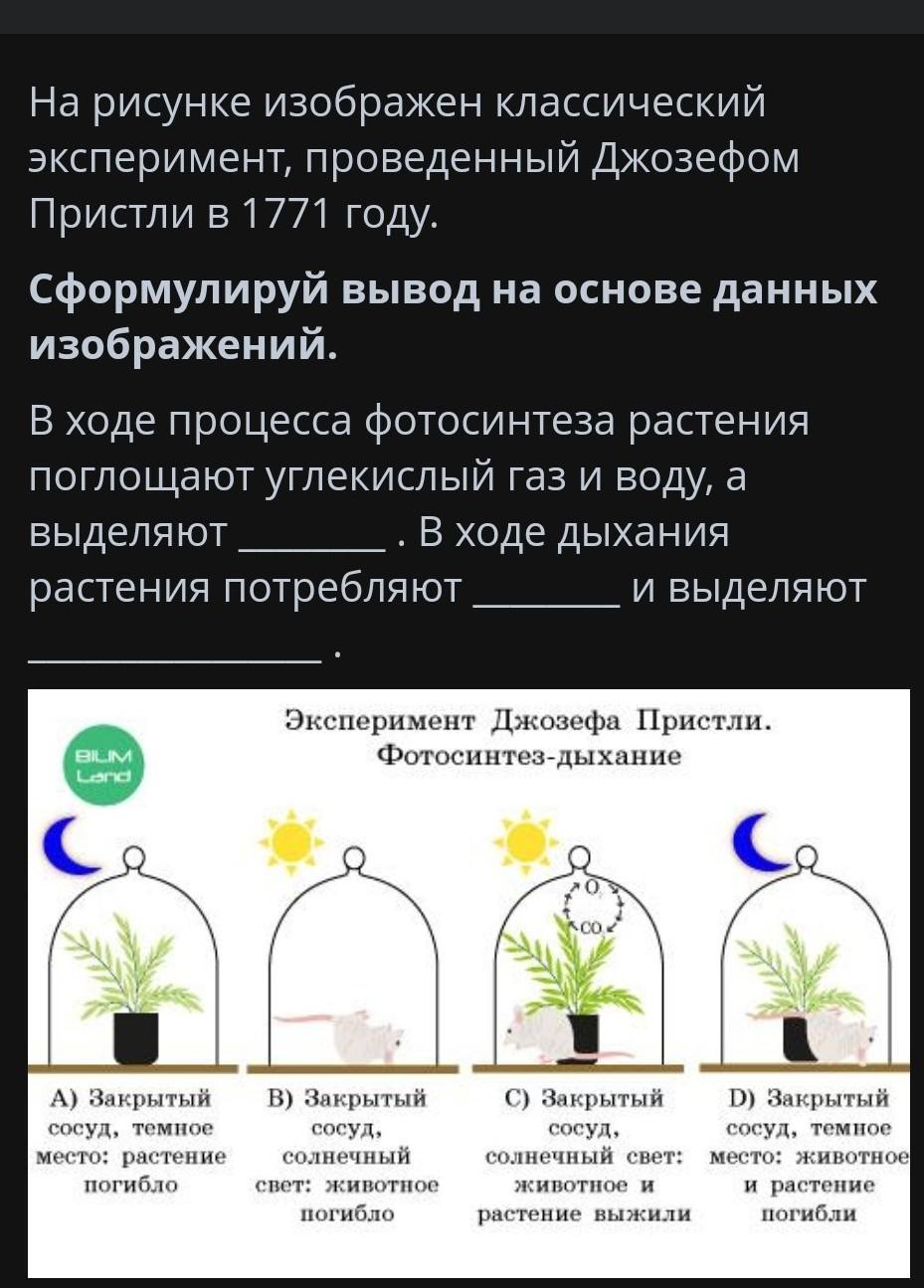 На рисунке изображен классический эксперимент, проведенный Джозефом Пристли в 1771 году. Сформулируй вывод на основе данных изображений. В ходе процесса фотосинтеза растения поглощают углекислый газ и воду, а выделяют В ходе дыхания растения потребляют и выделяют Эксперимент Джозефа Пристли. Фотосинтез-дыхание A) Закрытый сосуд, темное B) Закрытый сосуд, C) Закрытый сосуд, D) Закрытый темное место: растение солнечный солнечный место: животное погибло свет: животное животное и растение погибло растение выжили погибли