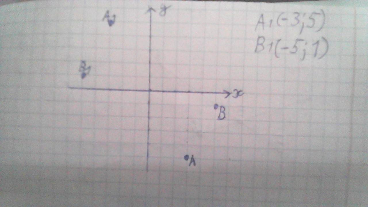 Даны точки А(3; -5), В(5; - 1). Отметьте эти точки на координатной плоскости и постройте точки А 1 и В 1 симметричные данным, относительно начала координат. Запишите координаты точек А 1 и В 1 .