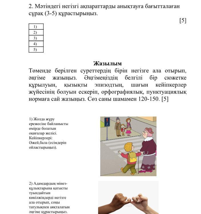 Төменде берілген суреттердің бірін негізге ала отырып, әңгіме жазыңыз. Әңгімеңіздің белгілі бір сюжетке құрылуын, қызықты эпизодтың, шағын кейіпкерлер жүйесінің болуын ескеріп, орфографиялық, пунктуациялық нормаға сай жазыңыз. Сөз саны шамамен 120-150. [5]