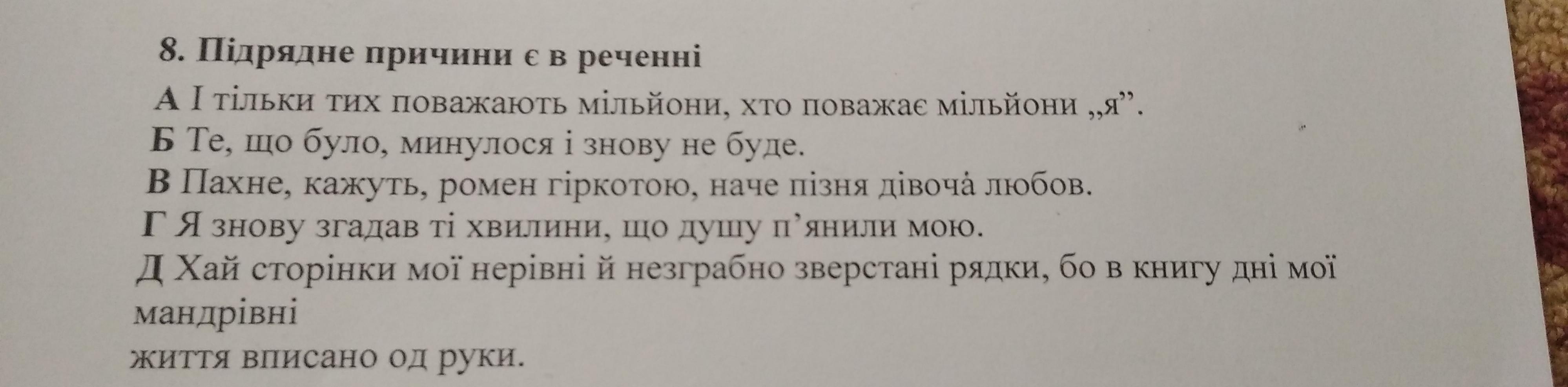 Підрядне причини є в реченні Д – Хай сторінки мої нерівні й незграбно зверстані рядки, бо в книгу дні мої мандрівні життя вписало од руки