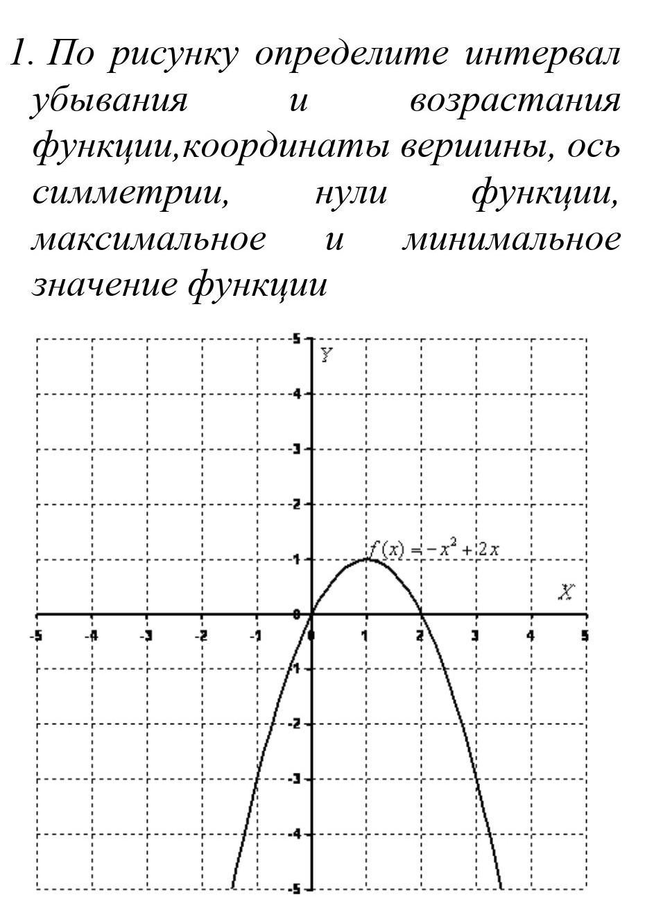 1. По рисунку определите интервал убывания и возрастания функции,координаты вершины, ось симметрии, нули функции, максимальное и минимальное значение функции