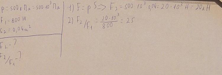 сила 800 Н. Площадь большого поршня 0,04 м2.