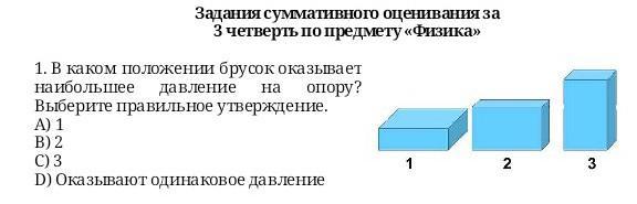 1. В каком положении брусок оказывает наибольшее давление на опору? Выберите правильное утверждение.