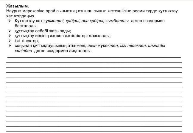 Наурыз мерекесіне орай сыныптың атынан сынып жетекшісіне ресми түрде құттықтау хат жолдаңыз.