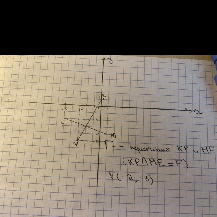 Нарисуйте на координатной плоскости точки E (-5; -2), K (0; 1), P (-3; -5), M (1; -4). Найдите координаты точки пересечения отрезков KR и ME.