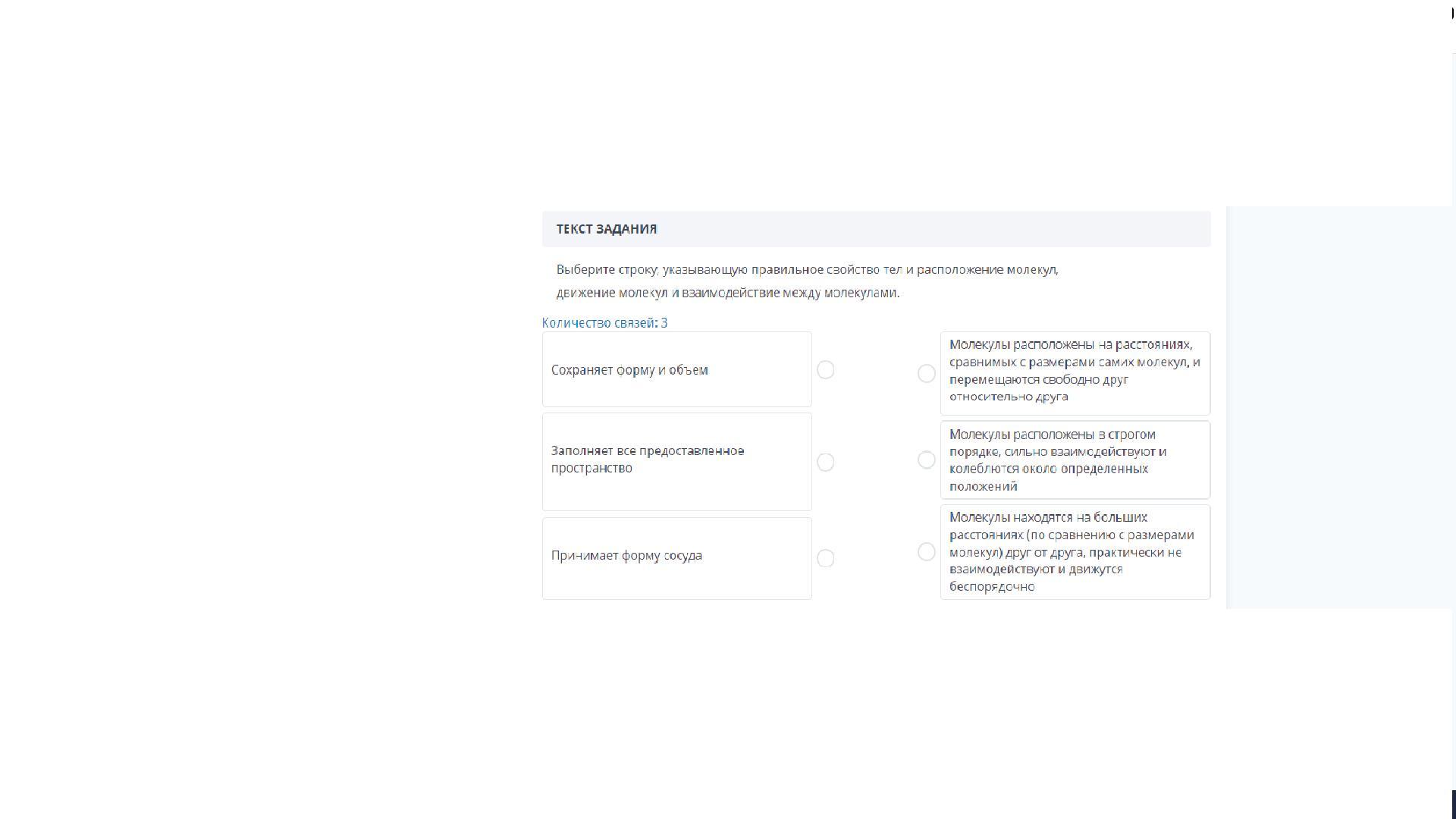 Выберите строку, указывающую правильное свойство тел и расположение молекул, движение молекул и взаимодействие между молекулами.