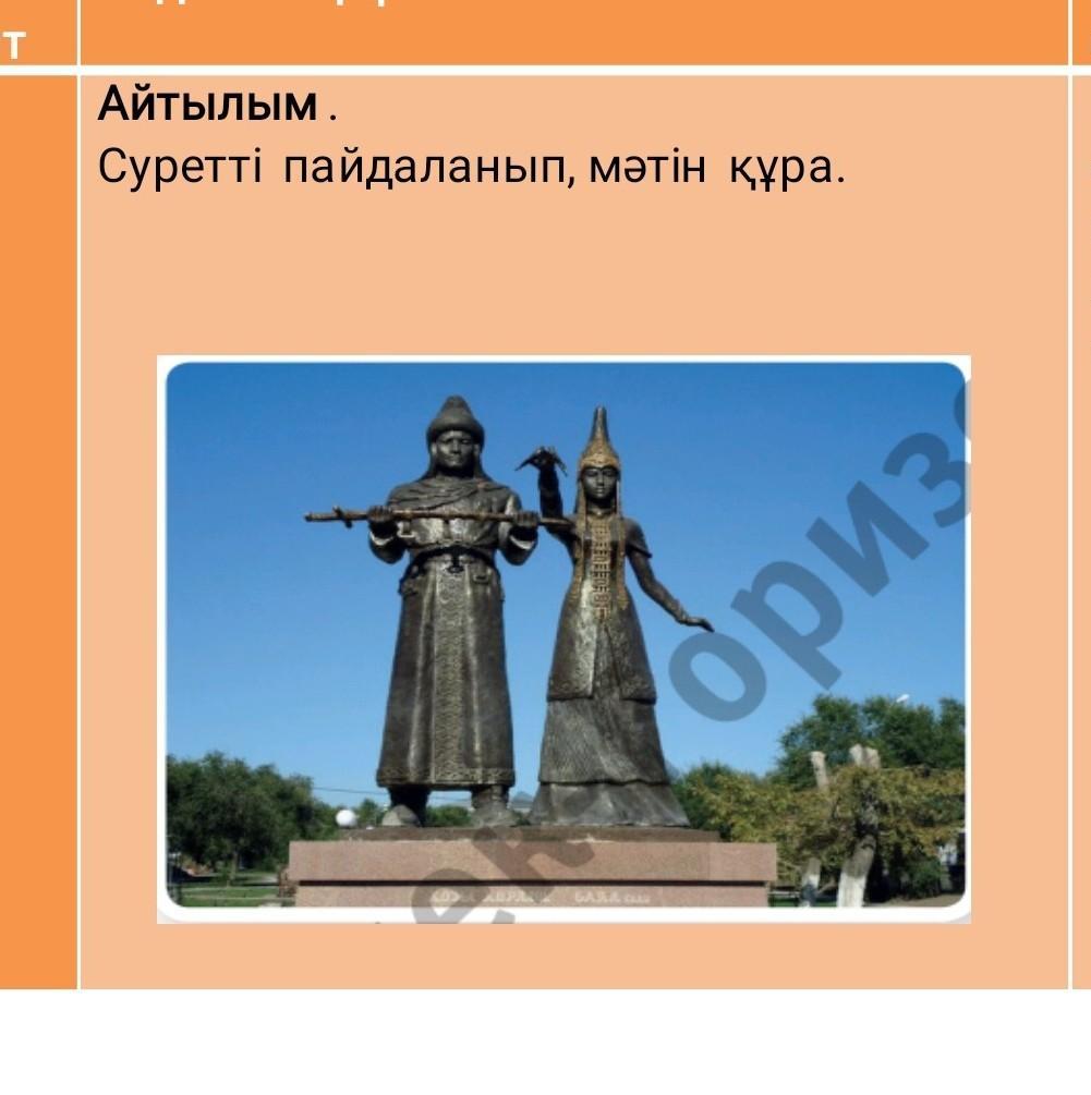 екі ескерткіш,қолында заттар бар. Мүсіндер