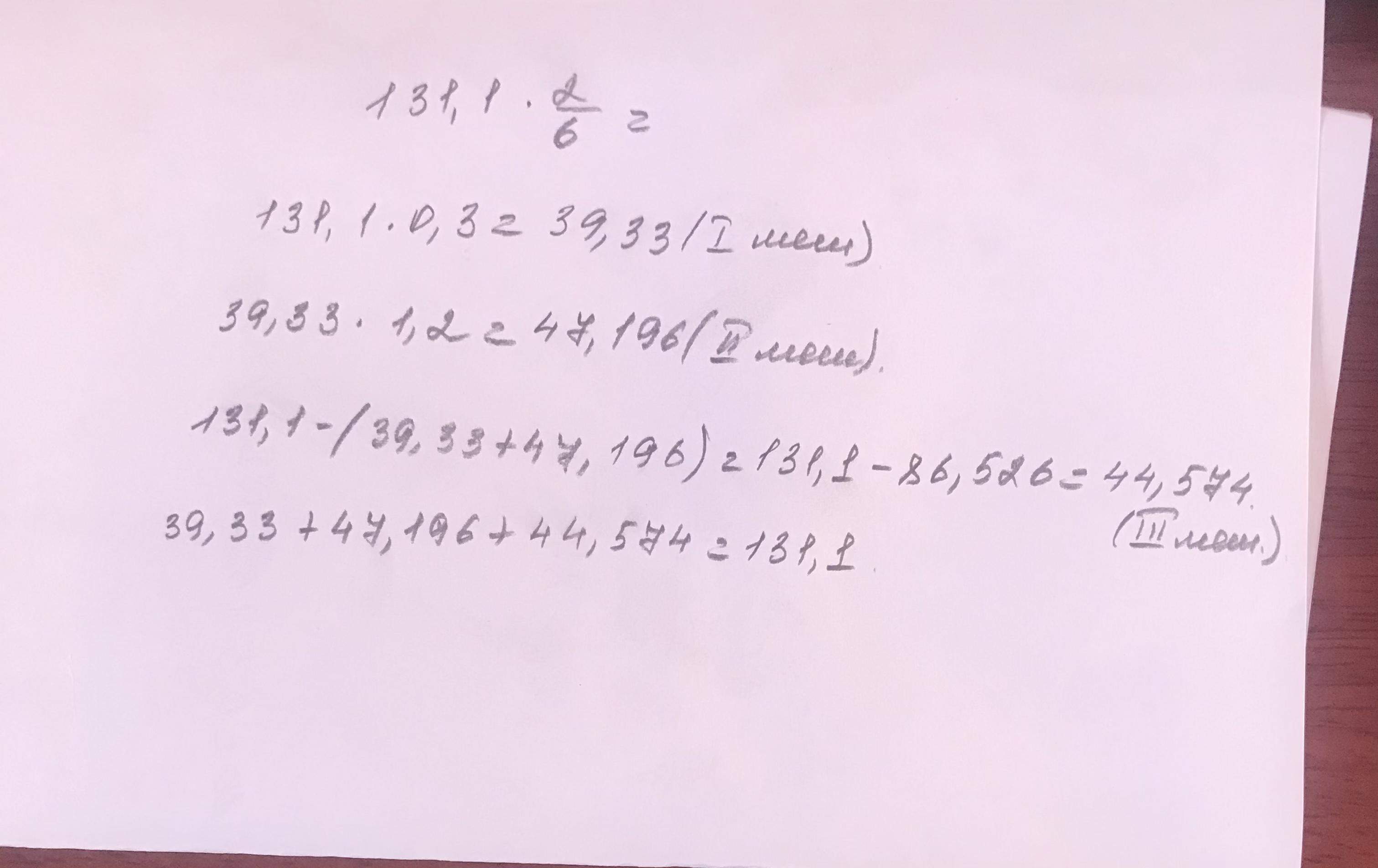 В трех мешках 131,1 кг капусты. Сколько капусты в каждом мешке, если в первом 2/6 всей капусты, а во втором – в 1,2 раза больше, чем в первом