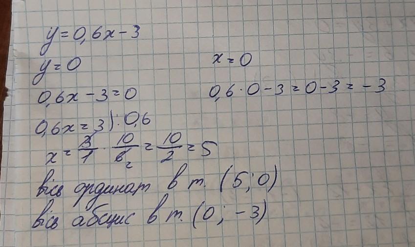 не виконуючи побудови знайти координати точок перетину графіка функції y=0,6x-3 з осями координат
