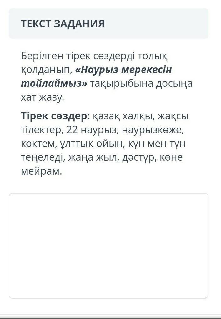 Берілген тірек сөздерді толық қолданып, «Наурыз мерекесін тойлаймыз» тақырыбына досыңа