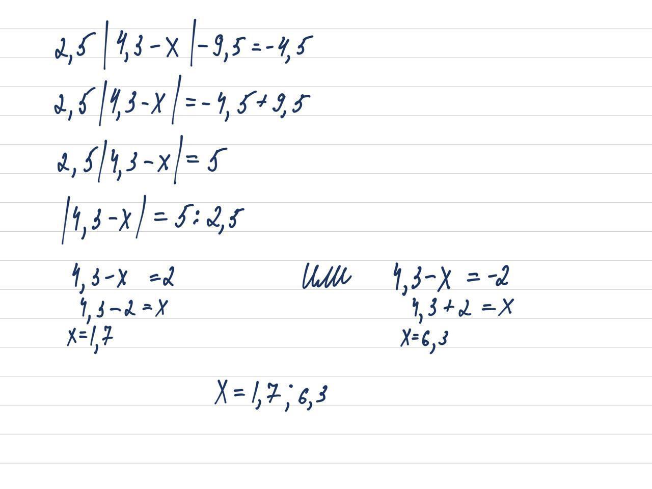 помогите решить уравнение 2,5 | 4,3 - x | - 9,5= -4,5