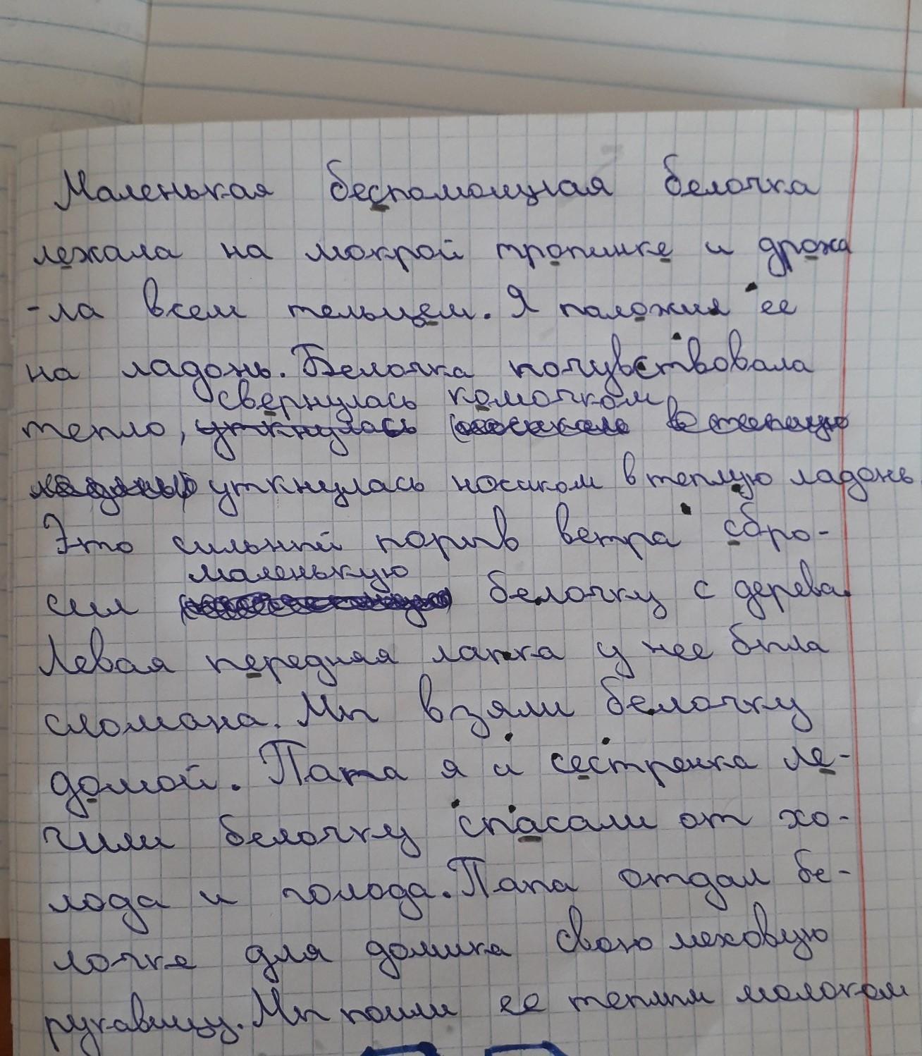 Маленькая бе...помощ(?)ная белоч(?)ка л...жала на мокрой тр...пинк... и др...жала всем тельц...м.Я пол...жил ее на ладонь.Белоч(?)ка почу(?)ствовала тепло св...рнулась к...моч(?)ком уткнулась носиком в теплую ладонь.Это сильный порыв ветра ...бросил маленькую белоч(?)ку с дерева.Левая п...редняя лапка у нее была сломана.Мы взяли белоч(?)ку д...мой.Папа я и с...стренка л...чили белоч(?)ку сп...сали от холода и голода.Папа отдал белоч(?)ке для домика свою меховую рукавицу.Мы поили ее теплым молоком.