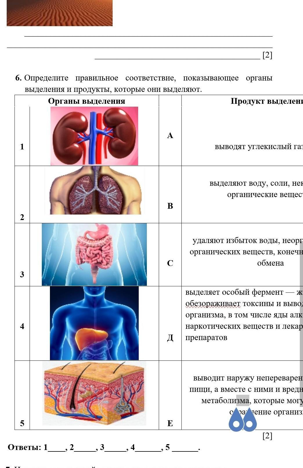 6. Определите правильное соответствие, показывающее органы выделения и продукты, которые они выделяют.