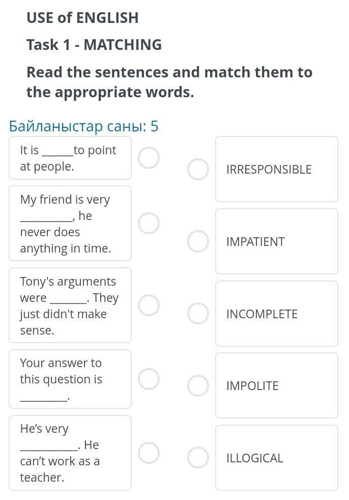 1- impolite 2- irresponsible 3- incomplete 4- illogical 5- impatient