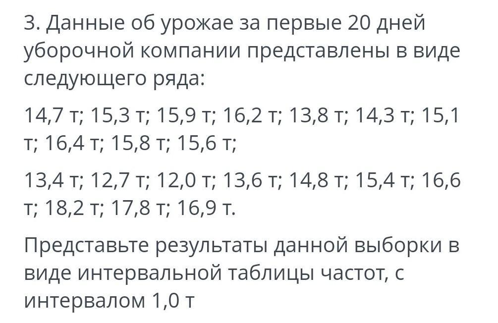 3. Данные об урожае за первые 20 дней уборочной компании представлены в виде следующего ряда: 14,7 т;B 15,3 т;B 15,9 т;B 16,2 т%;B 13,8 т%;B 14,3 т;B 15,1 т; 16,4 т;B 15,8 т; 15,6 т%; 13,4 т;B 12,7 т;B 12,0 т;B 13,6 т%; 14,8 т; 15,4 т;B 16,6 т;B 18,2 т; 17,8т; 16,9 т. Представьте результаты данной выборки в виде интервальной таблицы частот, с интервалом 1,0т