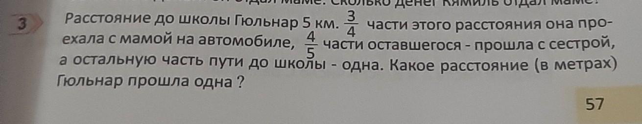 Сначала мы ищем одну часть из 3/4 , 5 км- 5000 м делим на 4 и умножаем на 3=3750 метров прошла. 5000 делим на 5 и умнож на 4 =4000 метров. селадваем 7750 и выяитаем, ток там не может быть 5 км