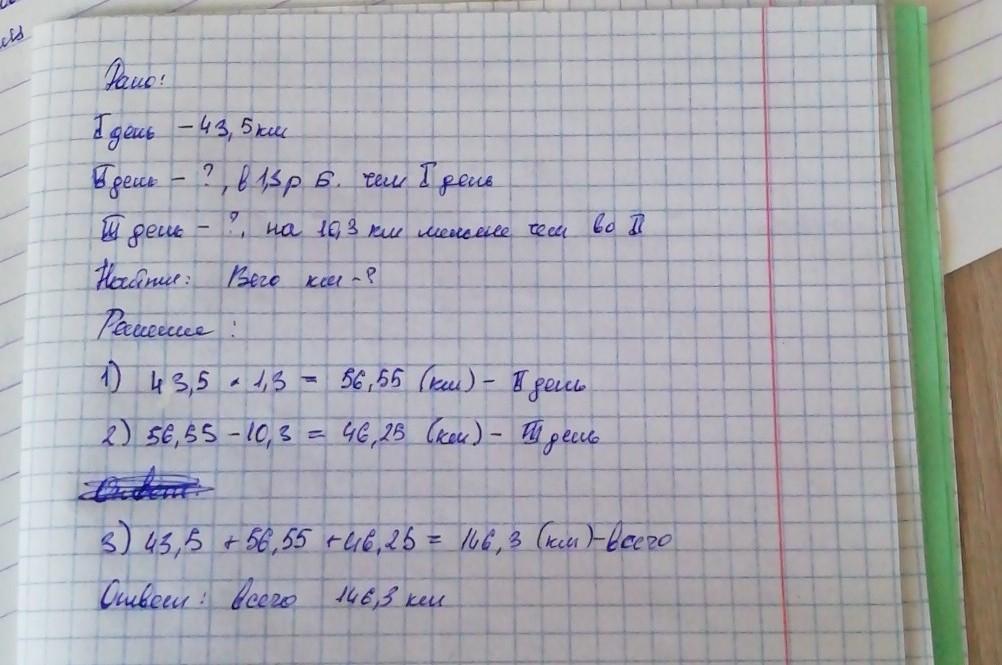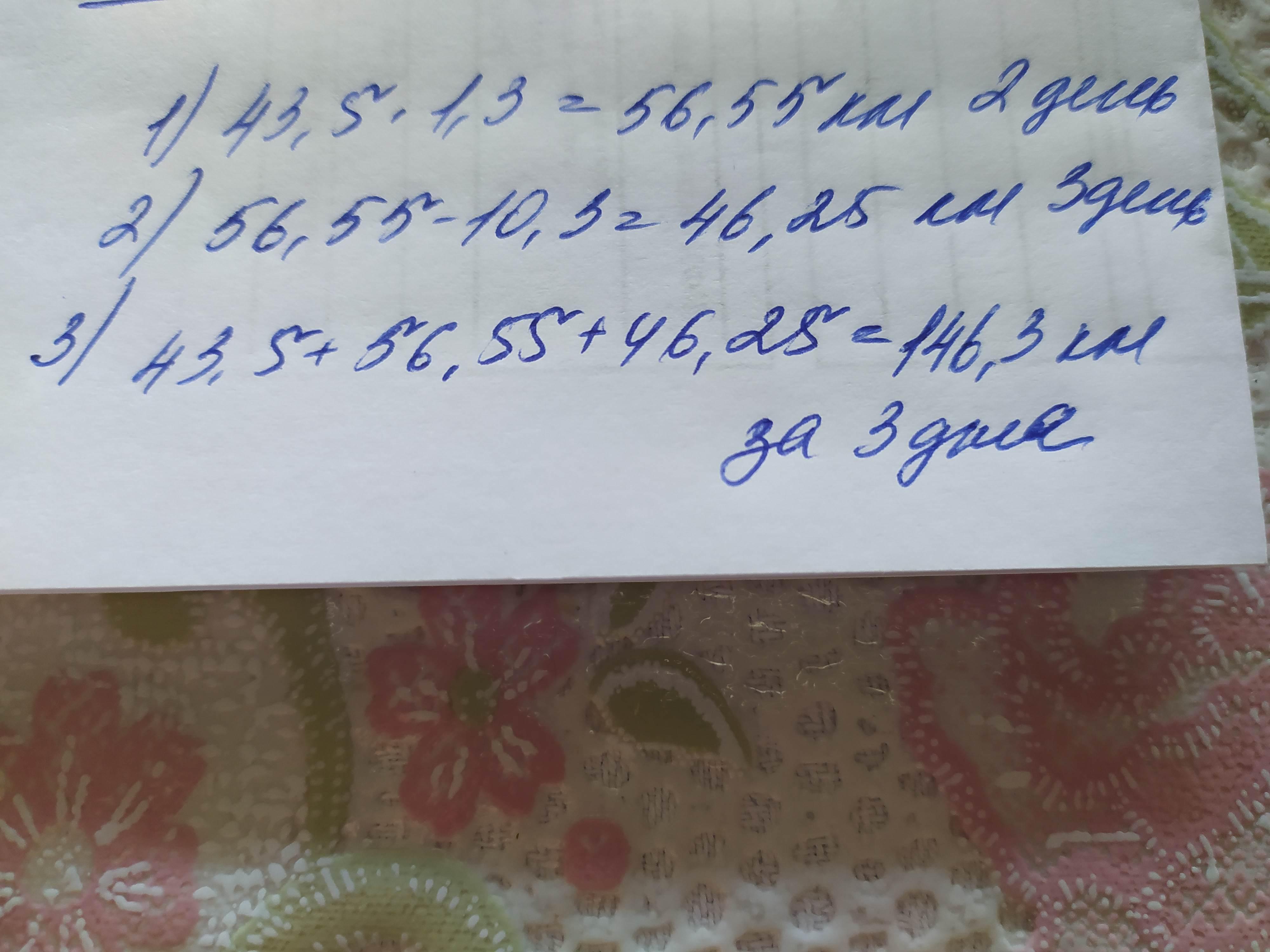Туристы в | день прошли 43,5 км во || день в 1,3 раза больше, чем в | ; а в ||| день на 10,3 км меньше, чем во ||. Сколько км всего за три дня?