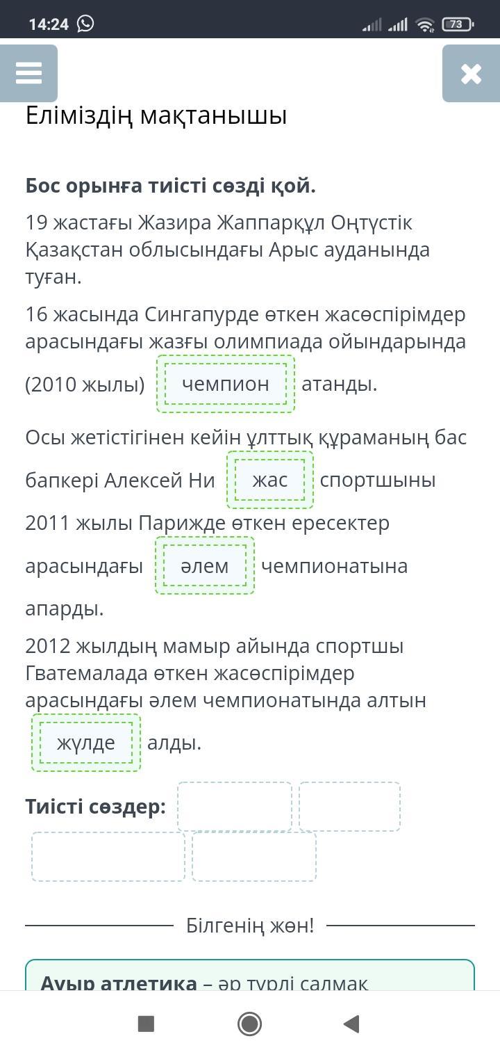 Тиісті сөздер: әлем, жас, чемпион, жүлде.