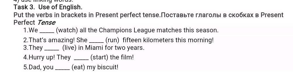 1. Watched. 2. Runs. Lived 4. Started. 5. Eaten