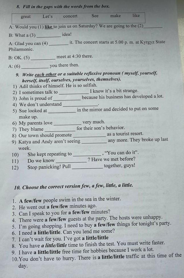 9. 2: myself; 3: himself; 4: each other; 5: herself; 6: each other; 7: themselves (пометка: это если родители адекватные); 8: itself; 9: each other; 10: herself; 11: each other; 12: yourselves