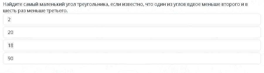 Пусть 1 угол = х, 2 угол= 2х( потому что, он в два раза больше первого), 3 угол = 6х( в шесть раз больше первого)