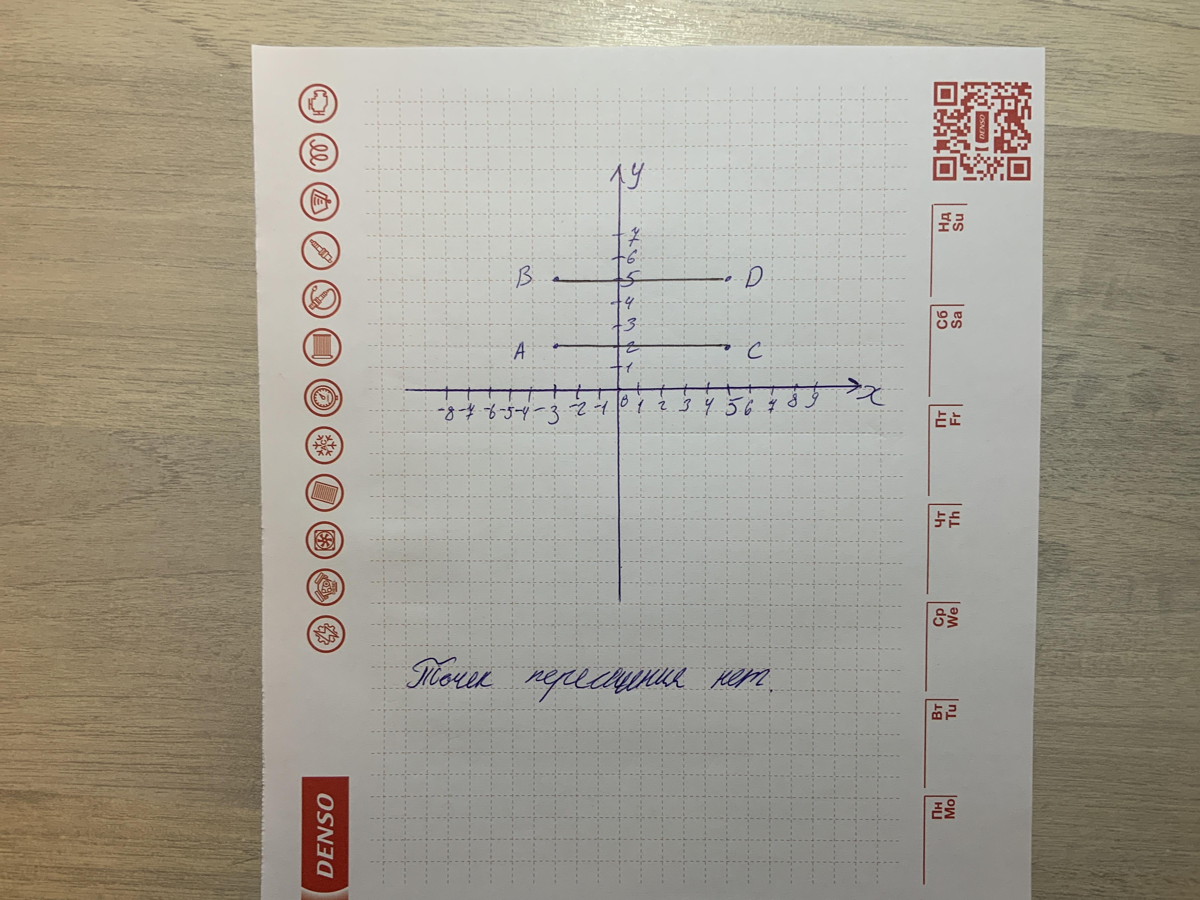 отметь на координатной плоскости точки А(-3;2), В(-3; 5), С(5; 2) и D( 5;5). Нарисуй прямые АС и ВD. Запиши координату точки Е, которая является пересечением этих прямых.