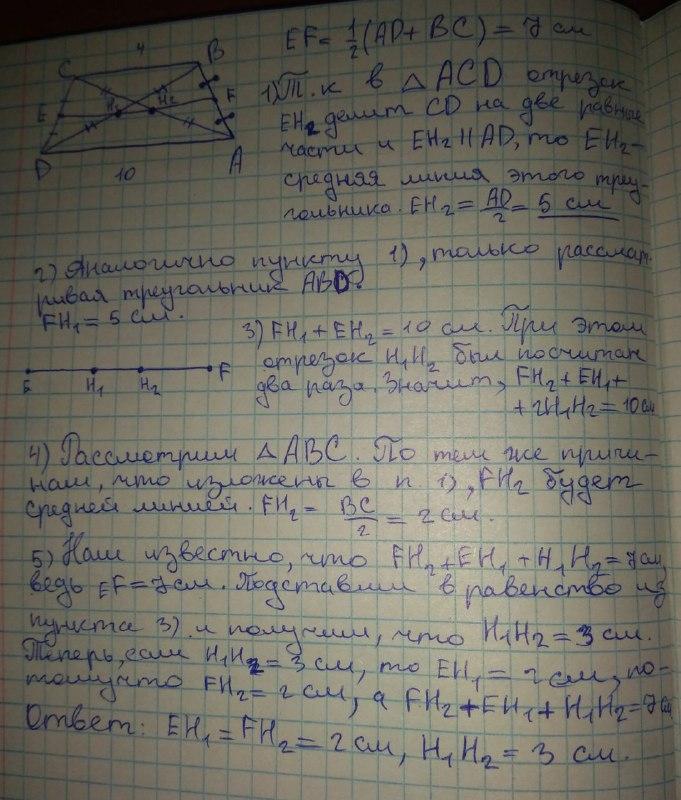 Основания bc и ad трапеции abcd равны соответственно 4 и 10 см. Диагонали BD и AC разбили среднюю линию трапеции на 3 отрезка. Найдите длины этих отрезков.