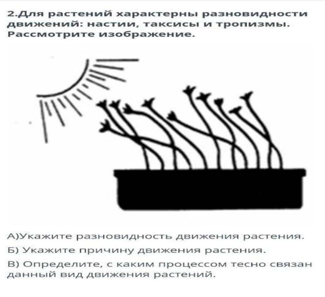 2.Для растений характерны разновидности движений: настии, таксисы и тропизмы. Рассмотрите изображение.