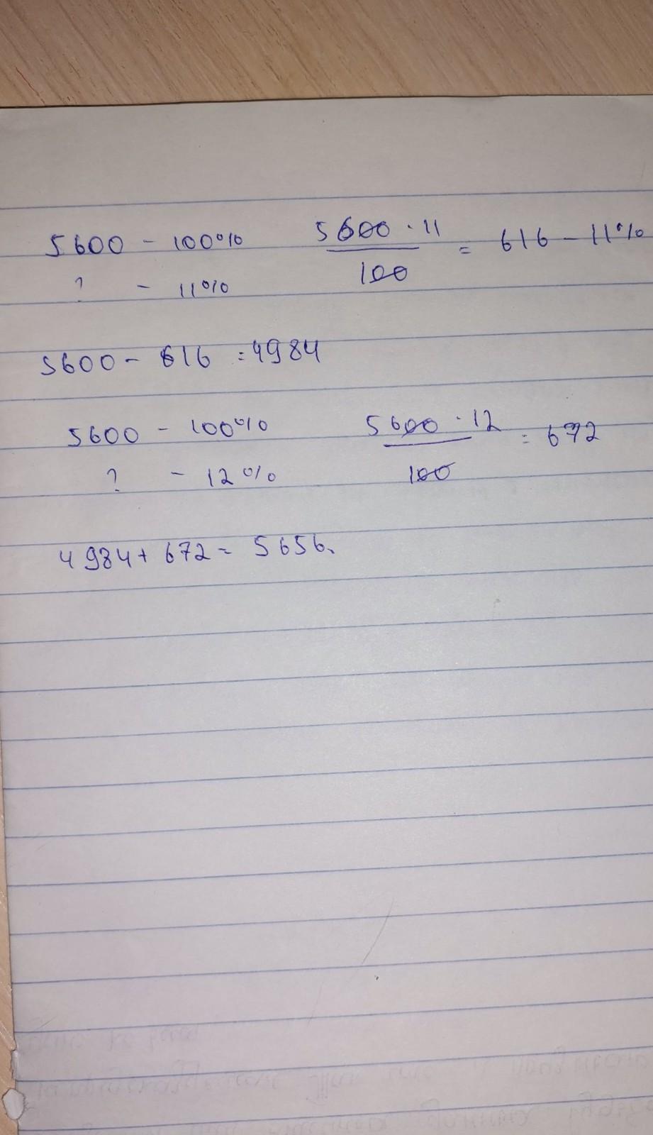 Товар в сагазине стоил 5600 руб. Сначала стоимость снизили на 11%, а потом повысили на 12%. Какова конечная стоимость товара?